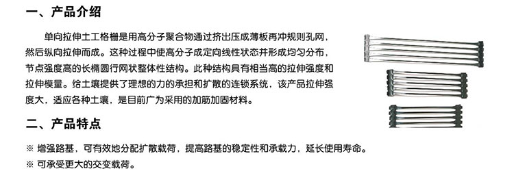 單向拉伸的土工格柵是由高分子聚合物經(jīng)擠出壓成薄板再沖規(guī)則孔網(wǎng),然后縱向拉伸而成。這種過程中使高分子成定向線性狀態(tài)并形成分布均勻、節(jié)點強度高的長 橢圓形網(wǎng)狀整體性結構。此種結構具有相當高的拉伸強度和拉伸模量,特別是我公司此類產(chǎn)品更具有超國際水平的高早期(伸長率在2%—5%)拉伸強度和拉伸模 量。給土壤提供了理想的力的承擔和擴散的連鎖系統(tǒng)。該產(chǎn)品拉伸強度大(>150Mpa),適應各種土壤,是目前廣為采用的加筋加固材料。